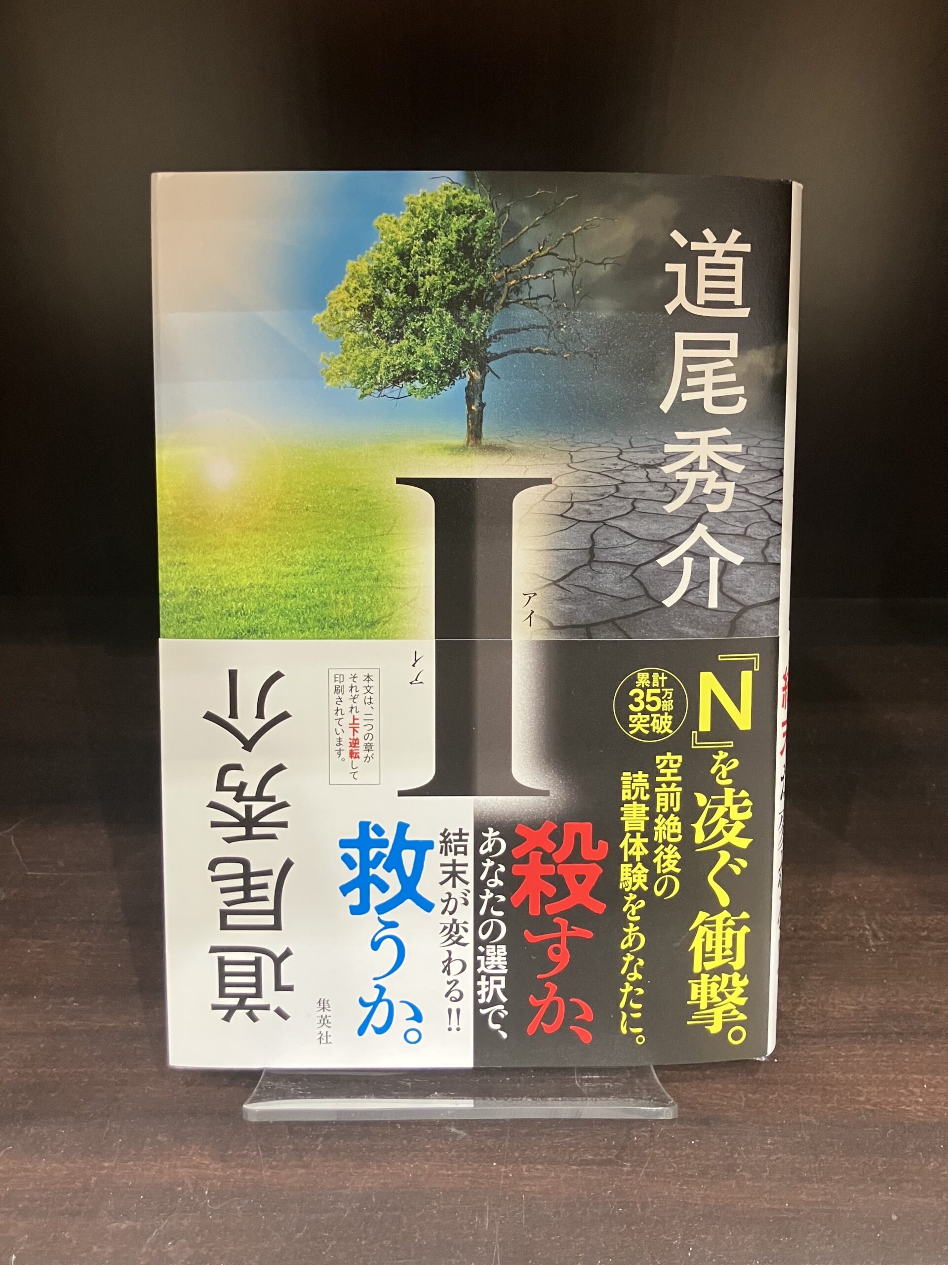 『I』は今までに読んだことの無いタイプの小説でした。そもそも表紙から変わっています。著者の道尾秀介さんの名前が二つ書かれているのですが、ひとつは上下が逆転しているのです。とりあえず帯を下にした通常の状態で本を開いてみれば、中の文章も逆転していて、「え?どうやって読むの?」と思ったのですが、最初に道尾さんからのメッセージがありました。それによると、この小説は二つの章から成る物語で、読む順番は自由だと。ただし、どちらを先に読むかで結末が大きく変わるのだとか。「どちらかの順番で読むと多くの人が命を失い、別の順番で読むと生き残る」そうです。つまり、「殺すか、救うか」は、読む人次第というわけです。